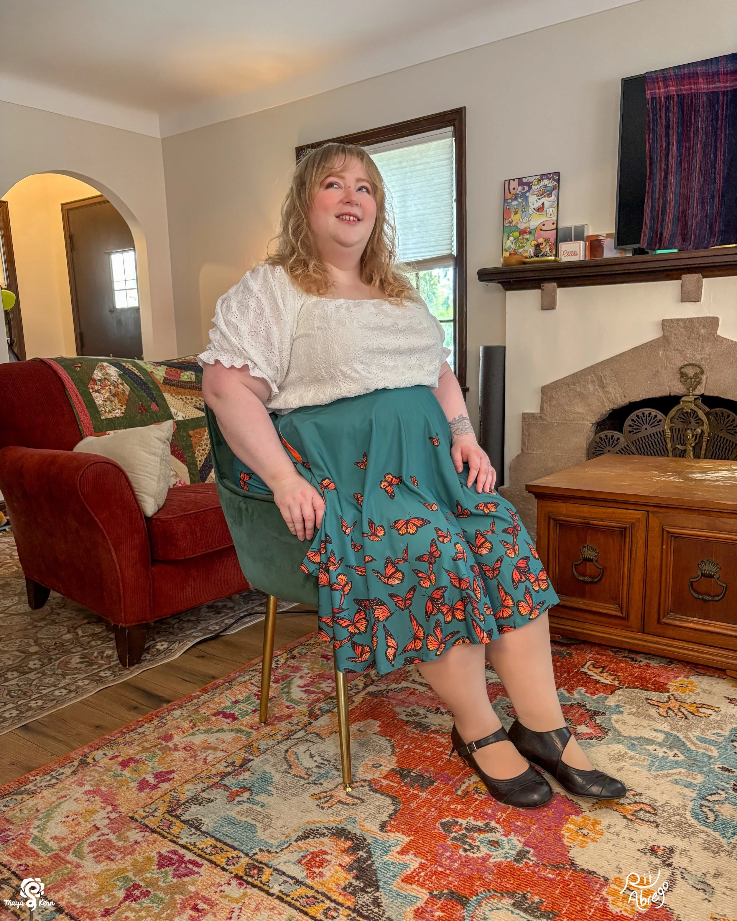 Our midi skirts are made with many positions in mind. Our designs will be on display whether you are standing or sitting. Our photography resources are temporarily limited, so here’s a selection of older photos featuring our hem designs worn while seated.
